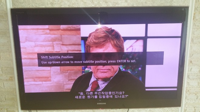 알고 계신지 모르지만 오포 자막의 위치를 위 아래로 변경 시킬 수 있습니다. 리모콘의 subtitle 버튼을 3초 정도 누르면 그림과 같은 안내가 나오고 이 때 up,down 키로 조정 하고 다시 enter를 누르면 됩니다.2.35 :1 화면의 영화린 경우 자막을 화면 밖으로 내릴 수 있어 좋았숩니다.