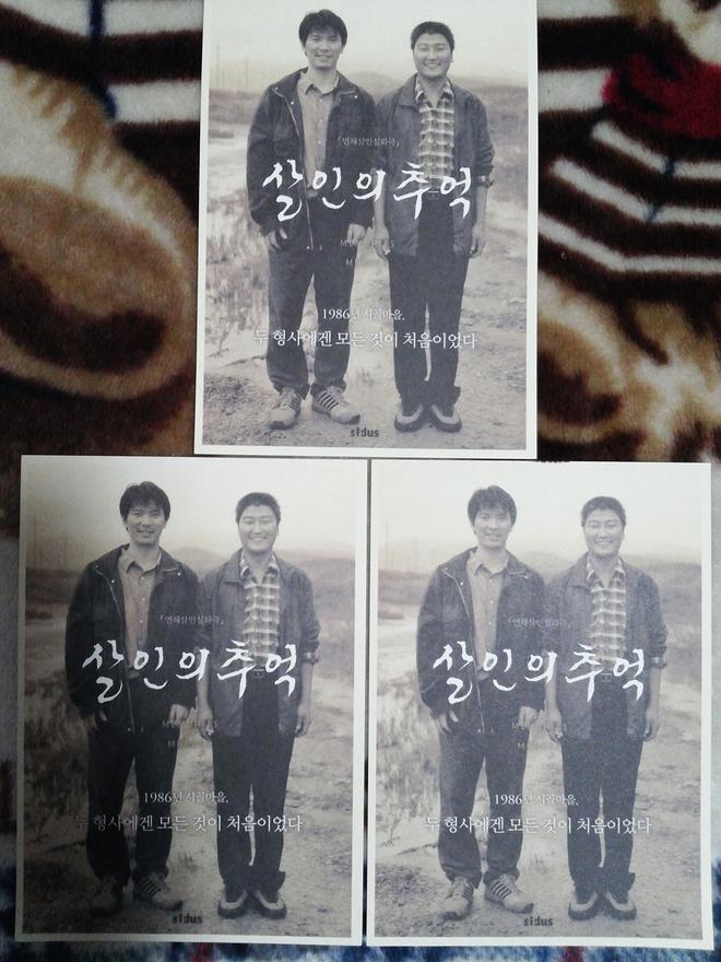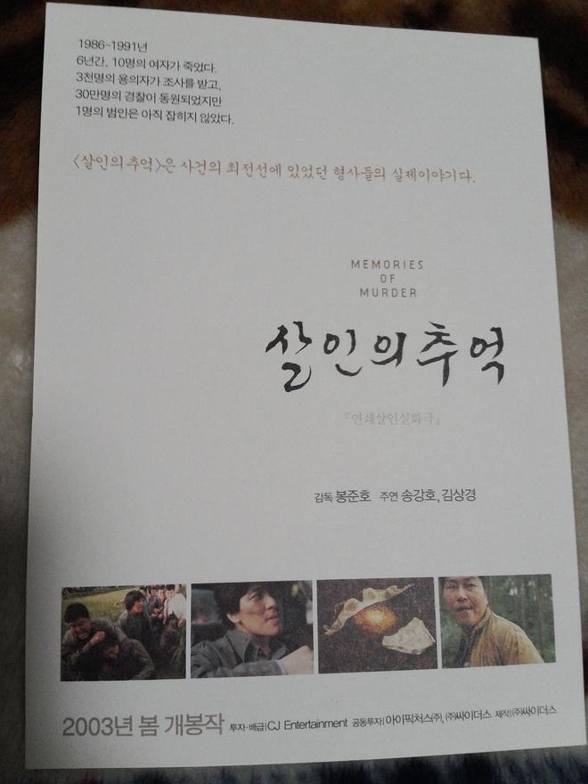 2003년에 개봉한 살인의추억...그당시 극장들 영화관 안에 비치된 전단지류등 중 이런 엽서모양의 예쁜 홍보물도 있었습니다. 살추 도 어느덧 20주년이 다 되가는군요!!