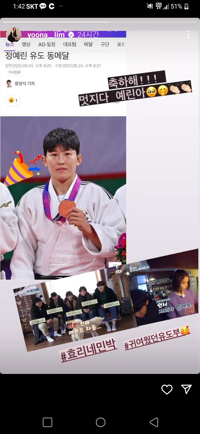 윤아는 스토리를 통해 축하를 전했고 정예린 선수도 감사하다고 올렸습니다.