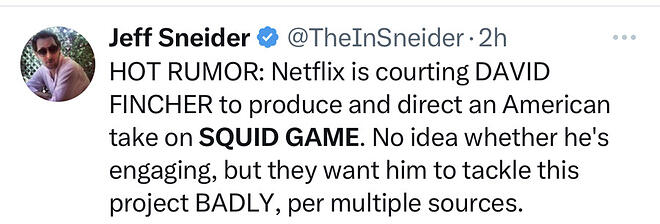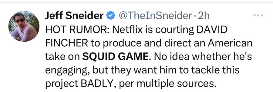 그의 성향상 모든걸 완벽하게 통제해야 하는데 초일류급인 핀처가 살펴야 할 대기 중인 작품들만 수십개 이상일거고, 그 중 한 작품에 불과할 '오겜'에 그 모든 프로젝트들을 캔슬하고 올인할 리가 없겠죠?