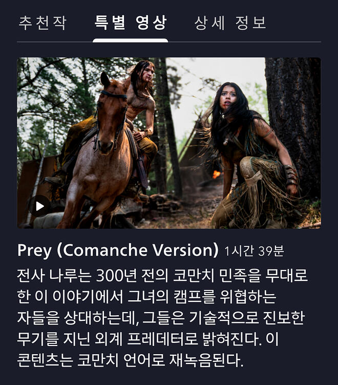 참, 1700년대 초가 배경으로 코만치족이 죄 영어해서 코만치어 버전으로 잠깐 봤는데 좋습니다. 물론, 배우 연기를 영어로 해서 입 모양이 다른 점과 코만치어 더빙 연기가 조금 영어보다 떨어지는 것 같은 느낌은 아쉽지만요. 차라리 코만치어로 촬영했으면 더 좋았을 것 같기도 해요.