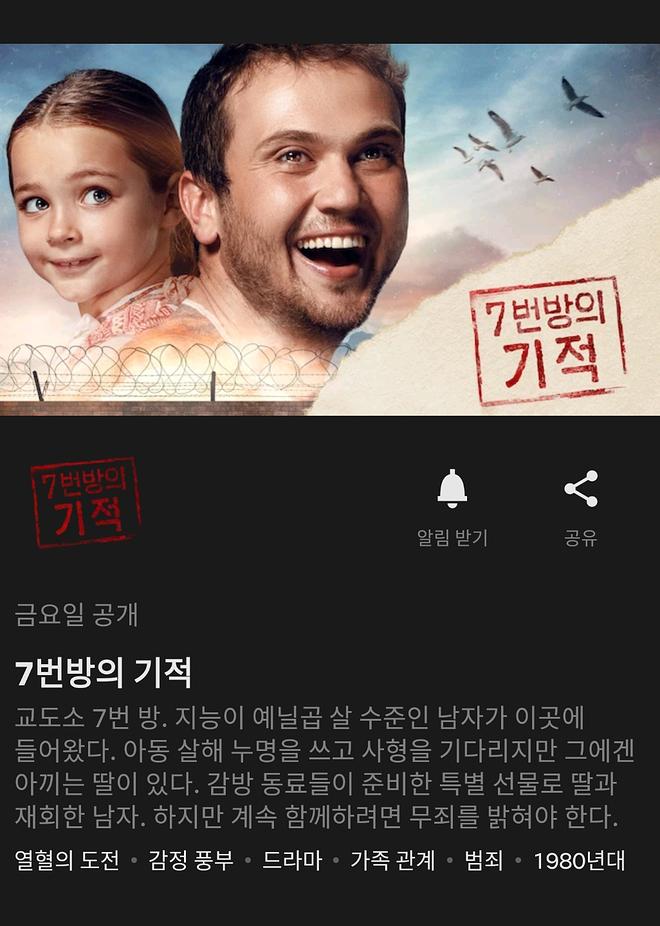 7번방의 기적은 우리영화 7번방의 선물 리메이크판인가 보네요.