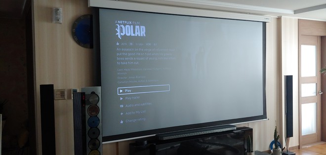 토요일에 강변 테크노마트 갔다가 재고가 딱 한개라는 말에 항상 그래왔듯 LG 4k 레이져 빔 프로젝터를 아무 생각없이 스크린도 없이 사왔다가 마눌님의 등짝 스매싱을 간신히 피하고 명절 지나자마자 스크린을 주문하고 기사분과 약속잡고 오늘 오전에 설치 했습니다. 일단 설치만하고 회사로 와서 제대로 시연은 못했습니다만. 일단 사진이라도 올려봅니다. DCS 광학 전동식 스크린입니다. 소리는 거실 블루투스 비엔오 스피거로 출력하니 2채널이지만 상당히 좋네요.