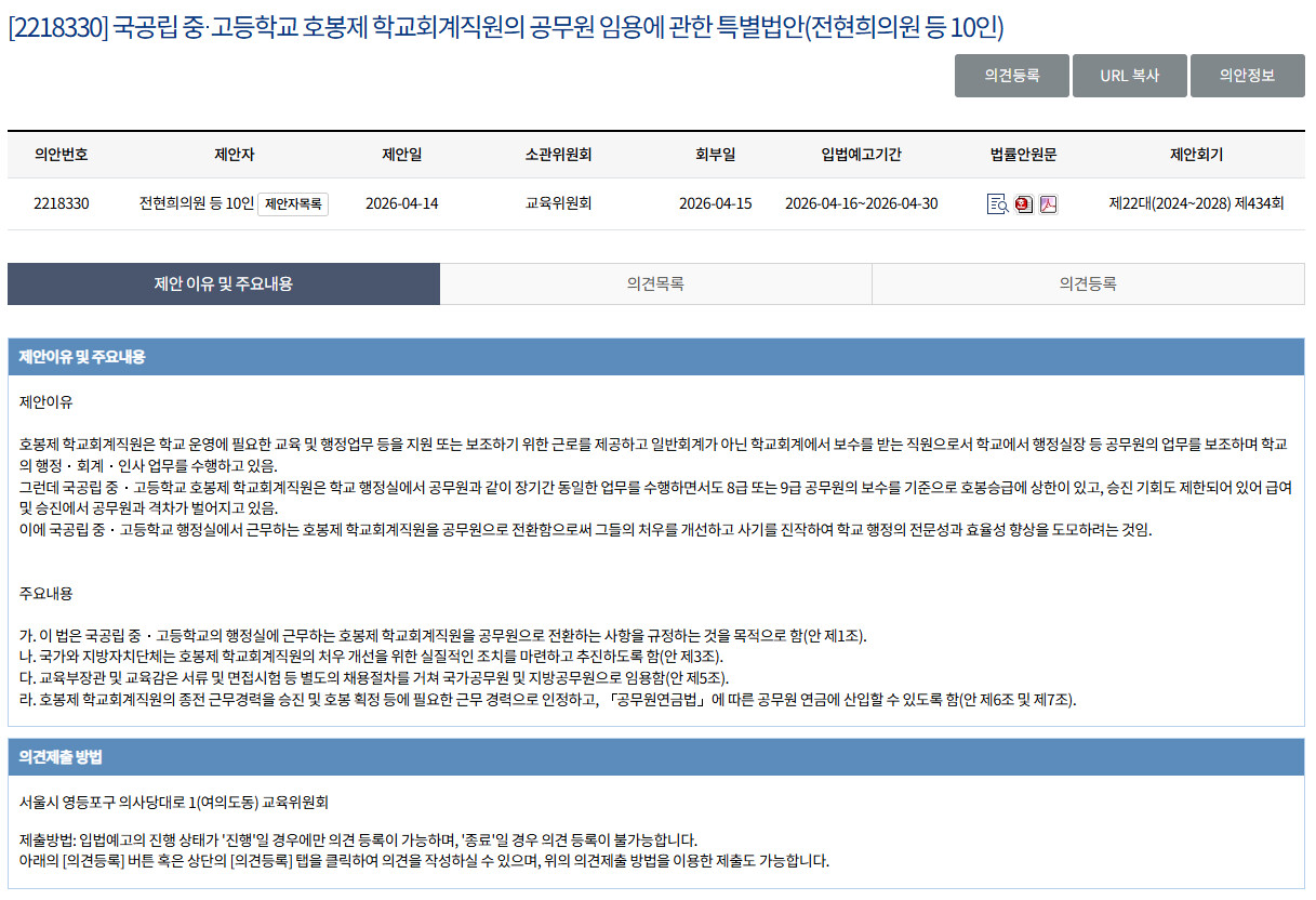 [정치] 국공립 중·고등학교 호봉제 학교회계직원의 공무원 임용에 관한 특별법안