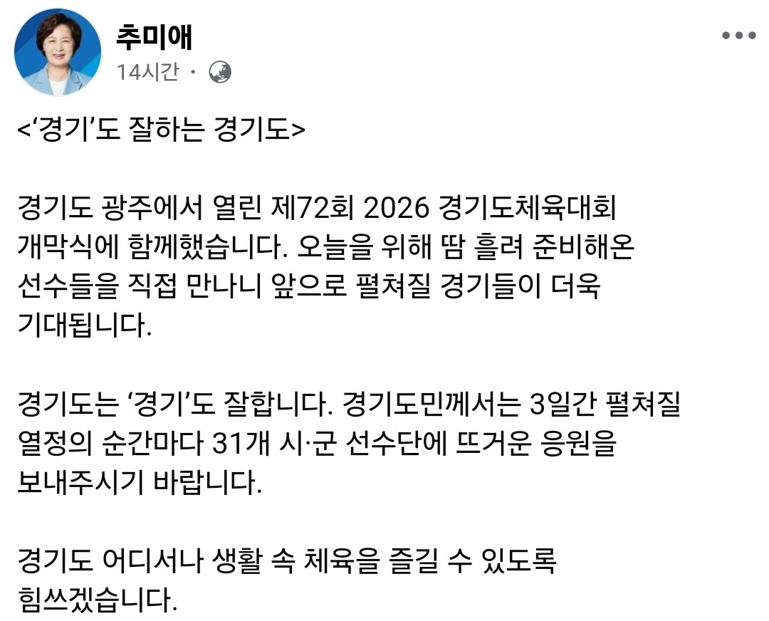 "경기도 어디서나 생활 속 체육을 즐길 수 있도록 힘쓰겠습니다." -추미애