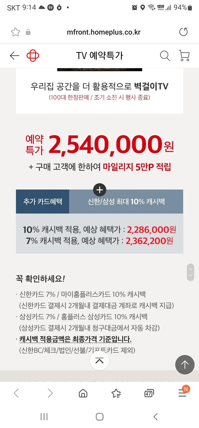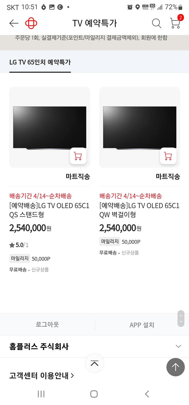 OLED65C1QNB 2월초 홈플에서 2,580,000 결제 무10개월 7% 캐시백(\180.600) 받아서 구입했었네요.