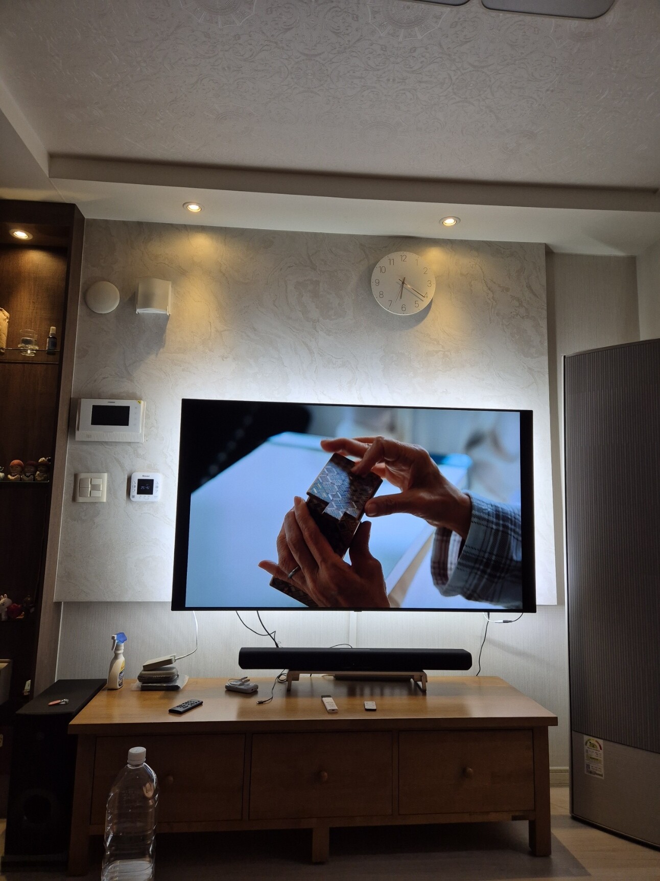 오 날카로우시네요. 일단 77인치를 선택한다면 그 벽면 조작패널 왼쪽 첫번째는 반 정도 가려지더라구요. 에어컨은 정자세로 비스듬히 놓으면 77인치까진 어떻게 설치가 되긴 하더라구요. 줄자로도 재봤습니다. ㅎㅎ 근데 oled 밀착벽걸이가 아니라서 벽면 조작패널 반은 가려져도 크게 상관없긴 해서요. |