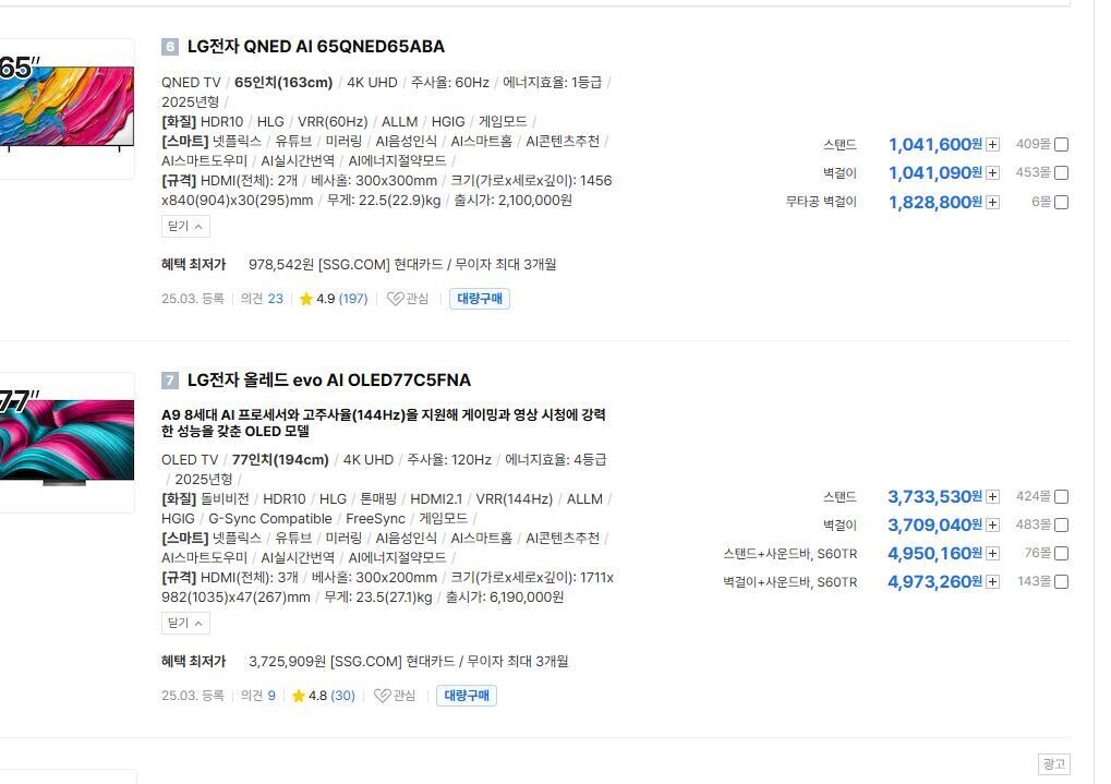 정도 하는군요. 대충 중간가격인 65 OLED G5 로 하는게 어떨까 싶습니다만, 써보신분들의 조언 부탁드립니다. G5와 G6는 25년형이냐 26년형이냐 차이로 80만원을 더 쓸 메리트가 있을지요?